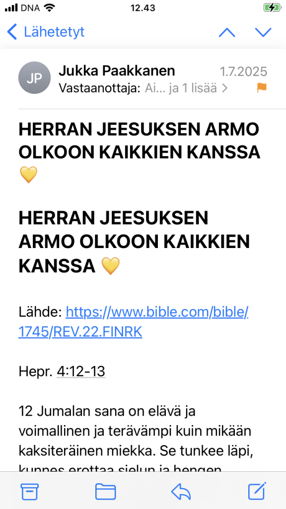 HERRAN JEESUKSEN ARMO OLKOON KAIKKIEN KANSSA 💛   Lähde: https://www.bible.com/bible/1745/REV.22.FINRK   Hepr. 4:12-13   12 Jumalan sana on elävä ja voimallinen ja terävämpi kuin mikään kaksiteräinen miekka. Se tunkee läpi, kunnes erottaa sielun ja hengen, nivelet ja ytimet ja tuomitsee sydämen ajatukset ja aikeet. 13 Mikään luotu ei ole hänelle näkymätön, vaan kaikki on alastonta ja paljastettua hänen silmiensä edessä, ja hänelle meidän on tehtävä tili.   Fil. 2:1-11   1 Jos siis on jotakin kehotusta Kristuksessa, jos jotakin rakkauden lohdutusta ja Hengen yhteyttä, jos jotakin sydämellisyyttä ja laupeutta, 2 tehkää minun iloni täydelliseksi, niin että olette samaa mieltä, että teillä on sama rakkaus ja olette sopuisat ja yksimieliset. 3 Älkää tehkö mitään itsekkyydestä tai turhan kunnian vuoksi, vaan pitäkää nöyrästi toista parempana kuin itseänne. 4 Älkää katsoko vain omaa parastanne vaan myös toisten. 5 Olkoon teillä se mieli, joka myös Kristuksella Jeesuksella oli. 6 Hänellä oli Jumalan muoto, mutta hän ei katsonut saaliikseen olla Jumalan kaltainen 7 vaan tyhjensi itsensä ja otti orjan muodon. Hän tuli ihmisten kaltaiseksi, ja hänet havaittiin olemukseltaan sellaiseksi kuin ihminen. 8 Hän nöyryytti itsensä ja oli kuuliainen kuolemaan asti, aina ristinkuolemaan asti. 9 Sen tähden Jumala onkin korottanut hänet korkealle ja antanut hänelle nimen, kaikkia muita nimiä korkeamman, 10 niin että jokaisen polven on notkistuttava Jeesuksen nimeen, niin taivaassa kuin maan päällä ja maan alla, 11 ja jokaisen kielen on tunnustettava Isän Jumalan kunniaksi, että Jeesus Kristus on Herra.   (Raamattu Kansalle)   Olet Raamatun Kirjoitusten – Jumalan Sanan – Kristuksen – Messiaan – Jumalan Pojan – Ihmisen Pojan – Elämän Lähteen – Armon Lähteen – Pelastajan todistuksen mukaan iankaikkisuusnäkökulmasta tarkastellen iankaikkisuusolennoksi luotuna ihmisenä pelastunut kaikkea syntiä kohtaavalta kadotustuomiolta ajallisen elämäsi päättyessä iankaikkisuudessa, kun olet ajallisessa elämässäsi Jumalan luomakunnassa  Jumalan sinua omakseen etsikkoaikanasi kutsuessa vastaanottanut Jumalan Armon – Pyhän Hengen – Kristuksen Veren Voiman – Herran Siunauksen Voitelun – Pyhän Hengen Kasteen – Jumalan ansiottoman Rakkauden Siteen – Pelastuksen Sinetin sisimpääsi.   Raamatun Kirjoitusten todistuksen mukaan Jumala HERRA JEESUS on Henki. Siellä missä Kristuksen Henki saa majailla pelastetun ihmisen sydämessä ja puhdistaa ja pyhittää Kristukseen ja Kristusta uskovan ihmisen ajallisen vaelluksen ihmisten edessä Jumalan Hengen johdatuksessa tässä ajallisessa elämässämme, siellä on pelastetun ihmisen sydämen sanoinkuvaamattoman suuri ilo ja rauha.   Elävän Israelin Jumalan HERRAN JEESUKSEN jatkuva läsnäolo uudestisyntyneen  hengen hengellisessä elämässä ihmisen sisäisessä rukouselämässä tuo Herrassa Jeesuksessa Kristuksessa – hengellisessä Kristuksen Ruumiissa – Elävän Israelin Jumalan seurassa ja ihmissilmin havaitsemattomassa hengellisessä seurakunnassa sisäisesti meissä Pyhän Hengen temppeleissä – Herran ilmestysmajoissa lähimmäistemme keskellä – Jumalan kuvissa Hänen luomakunnassaan antaa Armon osallisuudessa tuon pelastetun pyhän sydämen Rauhan. Se on sisäisen ihmisemme sydänten Rauhanruhtinaan Rauhanvaltakunta keskellämme. Jumalan lapset ovat Rauhantekijöitä – Jumalan valtakunnan toivonlähettiläitä Jumalan puimatantereilla Hänen luomakunnassaan ilosanoman viestintuojina lähimmäisilleen Jumalan Rakkaudessa ja Rakkaudesta luotujaan kohtaan.   Missä Jumalan Henki saa johdattaa pyhää Kristuksessa, siellä HERRALLA JEESUKSELLA on rukoilijoita Hengessä ja Totuudessa. Siellä Taivaallisen Isämme HERRAN JEESUKSEN tahto saa myös maan päällä jokahetkisesti tapahtua uskollisesti ja kuuliaisesti vaeltavan uudestisyntyneen Jumalan lapsen ajallisessa elämässä.   Oletko sinä todella pelastettu sielu? Onko sinulla Jumalan Elämä sisimmässäsi? Tutkiskele itseäsi. Onko sinussa Kristuksen Henki? Tunnetko sinä henkilökohtaisesti Pelastajasi? Oletko sinä Jumalan lapsi? Oletko sinä Herran lammas? Kuljetko sinä Hyvän Paimenen laumassa Pyhän Hengen johdatuksessa ajallisessa elämässäsi Kristuksen Hengen mukaisesti pyhityselämässä iankaikkiseen Elämään Herrassamme Jeesuksessa Kristuksessa?   Älä suotta syyllisty turhaan itsepetokseen itseksesi. Sinä tiedät varmasti, jos sinusta itsestäsi riippumaton Jumalan HERRAN JEESUKSEN Pyhä Henki puhuttelee uudestisyntynyttä henkeäsi sisäisesti sinussa hengellisessä rukousmaailmassa. Sinä tiedät varmasti, jos olet suostunut alistamaan lihallisen sielullisen elämäsi Pyhän Hengen ja Jumalan Sanan toinen toistaan kiistattomasti  vahvistavan sisäisen hengellisen todistuksen tuottamaan hengelliseen kasvuun Jumalan lapseudessa ja ojentautumaan lihallisessa elämässäsi Taivaallisen Isämme tahtoon ajallisessa Pyhän Hengen toimeenpanemassa elämäsi synneistä puhdistuksessa ja pyhityselämässä Herrassamme Jeesuksessa Kristuksessa Hänen luomakunnassaan maan päällä.   Saattavatko lähimmäisesi havaita Elämän Valon sinussa? Saako elämäsi todistus Herrassamme Jeesuksessa Kristuksessa sinulle rakkaat lähimmäisesi astumaan henkilökohtaisesti tälle ainoalle iankaikkisuusolennolle Jumalan Viisaudessa ennalta valmistetulle korvaamattoman arvokkaan sielun pelastustielle Herrassamme Jeesuksessa Kristuksessa Jumalan Pyhän Hengen osallisuudessa lyhytkestoisessa ajallisessa lihallisessa ihmiselämässä etsikkoaikanaan Jumalan luomakunnassa Tiellä Totuudessa Elämään?   Onko sinussa todella Elämän Henki? Onko sinulla todella Pelastuksen Sinetti? Kaikki, joita Kristuksen Henki johtaa, ovat Jumalan lapsia – hengettömät uskonnolliset muotojumaliset maailman lapset keskinäisessä joukkopetoksessa suotta valheellisesti toinen toistaan vailla Kristukse