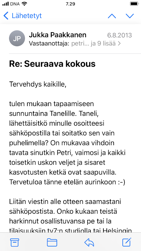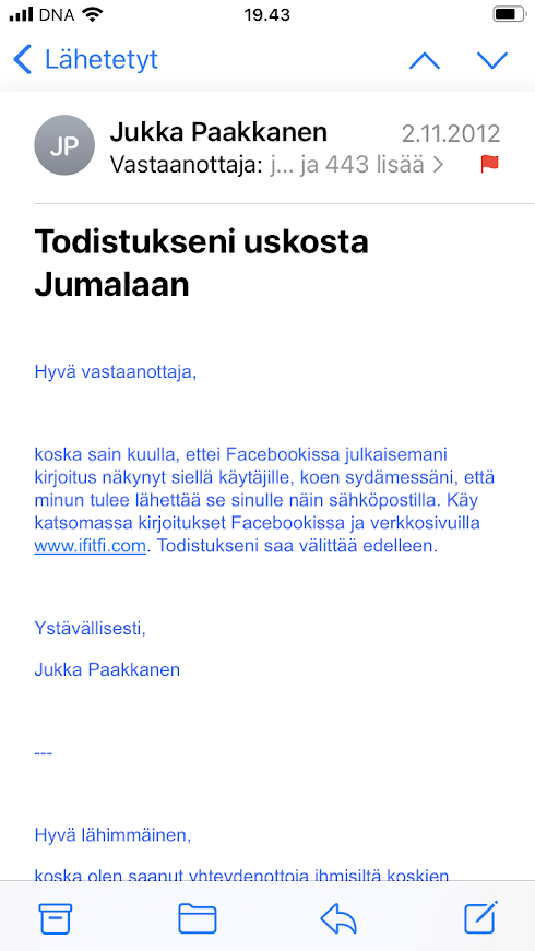 Alla oleva sähköposti on kristityn lähimmäisen todistus uskosta ja elämänkatsomuksesta ex-kollegoille. Todistus kestää kriittisenkin tarkastelun. Tänään koin, että minun tulee jakaa todistukseni tiedoksi myös sinulle. Todistukseni on osoitus kuuliaisuudesta Luojalleni. Kirjoitus on henkilökohtainen uskontunnustus ja toivon, että sinä kykenet sen myös sellaisena käsittelemään. Usko Jumalaan on jokaisen henkilökohtainen yksityisasia. Se on yksityisasia ihmisen ja Jumalan välillä. Usko Jumalaan on meidän kaikkien yhteinen asia silloin, kun me uskossa haluamme todistaa omalla elämällämme toinen toisillemme valinnastamme vahvistaaksemme toinen toisiamme pitämään kiinni lupauksista, jotka meille on annettu. Olen kulkenut läpi elämän uskossa – välillä horjahdellen. Olen aina saanut kokea Jumalan johdatuksen ja rakkauden luotuaan kohtaan. Tässä luottamuksessa minun on ollut hyvä taivaltaa – tänäänkin. Tässä ja nyt.