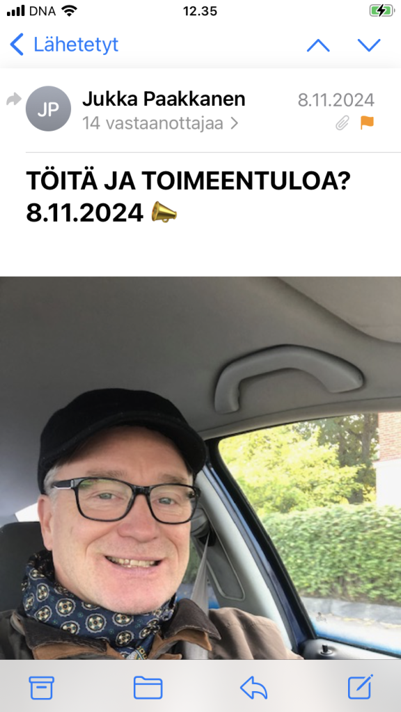 | Tervehdys Tiina ja Miia,välitän teille tiedoksi eilisen 8.9.2025 avoimen työnhakumuistutussähköpostini lähimmäisilleni. Lähetän kopion tästä viestistä myös infolle, joka yleisluontoisesti vastaili muutamaan 4.8.2025 kello 9.28 esittämääni kysymykseen jälkijättöisesti sähköpostilla 3.9.2025 kello 15.01. Alla on otteena koko saamani vastausviestin asiasisältö tiedoksi teillekin:”Hei Jukka,palaamme kysymyksiisi, koska olet tätä vielä erikseen tapaamisessa 18.8.2025 toivonut. Valtion TE-toimistot ovat lakanneet vuoden 2024 vaihteessa ja 1.1.2025 alkaen työnhakijoita on palveltu alueellisesti, tässä tapauksessa Keski-Uudenmaan työllisyysalueen TE-palveluiden toimesta. Velvoittavat kutsut sekä tapaamiset asiakkaan omassa kotikunnassa perustuvat Työttömyysturvalakiin (1290/2022) sekä Lakiin työvoimapalveluiden järjestämisestä (380/2023).Työn aktiivinen hakeminen on työnhakijan velvollisuus ja lopullinen päätös työnantajan. Työllistymistä edistäviä palveluita, kuten työvoimakoulutukset, työkokeilu ja työnhakuvalmennukset, voidaan tarjota työllistymisen tueksi ja edistämään pääsyä työelämään. Jatkossa voimme huomioida toiveesi asioida Hyvinkään palvelutorilla TE-palveluiden tiloissa.yt. Keski-Uudenmaan TE-palvelut”Jaoin tämän alla olevan sähköpostini 8.9.2025 sisällön laajalla jakelulla myös WhatsAppissa lähimmäisilleni. Sain useamman rakentavan palautteen viestiini. Julkaisen teille alla otteen vastauksestani eräälle palautteen antajalle:”Tervehdys Nimi, sain äsken puhelun kesken vastauksen kirjoittamisen. Kiitos suorasta, analyyttisesta ja hienosta palautteesta työnhakuviestiini liittyen. On aina ilo saada rakentavaa palautetta. Tarkoituksella tahdon herätellä lähimmäisiäni ymmärrykseen siitä, että pitkään eläkekertymän kerryttämisestä sivussa pidettynä, en tule enää tarjoamaan työtäni kenenkään hyväksi ilman tuntuvaa kertaluontoista lisäeläkemaksua tai keskivertoa suurempaa kuukausipalkkaa tulevina mahdollisina työvuosinani ennen eläköitymisikää. Palkkapyyntöni on siis heräte ajattelemaan sitä, kuinka ihmisiä voidaan pitkäkestoisesti yhteiskuntajärjestelmässä kohdella tai ei voida kohdella. Elän kyllä hyvää elämää nykyiselläänkin, vaikka ihmettelen sitä, ettei osaamiseni ja valmiuteni tehdä töitä kelpaa suomalaiseen työelämään. Evankeliumi on ilmaista. En kerro lähimmäisilleni evankeliumia rahasta vaan rakkaudesta Totuuteen. En siis näe uskonnollisia elinkeinonharjoittajia tulevina työnantajinani. Arvostan keskiluokkaista hyvää elämääni ja toivon, että saan vastakin nauttia onnellista peruselämää Jumalan Rakkaudessa osallisena tämän ajallisen elämäni keston. Vanhuuden arjen turvaksi tarvitsen eläkkeen kaikkien lähimmäisteni tapaan. Mahdollisuus ansaita työvuosina koulutustason mukainen keskivertoeläke vanhuuden turvaksi on ainoa mittari ajallisessa elämässä, joka määrittää nykytilanteessa palkkatason, jolla teen töitä työelämässä ajassa. Reipasta syksyn jatkoa sinulle ja rakkaillesi Nimi. Valoa ja iloa. Jukka 👍🙂🇫🇮” Ja tässä on teille tiedoksi toinen ote tämän aamuisesta vastauksestani eräälle lähimmäiselleni: ”Huomenta Nimi, kiitos työnhakuani edistävästä asenteesta ja suhtautumisesta tilanteeseeni työnhakijana. Olen kiinnostunut kaikista todellisista työmahdollisuuksista, jotka tarjoavat vuosiksi toimeentulon tuottavan näköalan elämään. Reipasta syksyn jatkoa sinulle ja rakkaillesi Nimi. Valoa ja iloa. Jukka 👍🙂🇫🇮” Toivon tämän sähköpostin sisällön osoittavan teille Tiina ja Miia, kuinka nykytilanteessa haen aktiivisesti työmahdollisuuksia jatkuvasti, vaikka 18.8.2025 laaditussa aktivointisuunnitelmassa ei työnhakuvelvoitetta ole minulle enää perustellusti asetettukaan. Hyväksyin tietojärjestelmässä 18.8.2025 suunnitelman sellaisenaan, vaikka se sisälsi pieniä asiavirheitä. Alla on ote viestistäni eräälle lähimmäiselle aktivointisuunnitelman laatimiseen 18.8.2025 jälkeen: ”Alla on tiedoksi sinulle Nimi tänään 18.8.2025 minulle laadittu ja äsken tietoverkossa hyväksymäni aktivointisuunnitelma. Ei työnhakuvelvoitetta. Sotilaseläkkeelle siirtyminen 55-vuotiaana on vanhaa tietoa viime vuodelta käydyssä keskustelussa mainittua asiaa, joka on vääränä tietona jäänyt hyväksyttäväksi minulle lähetettyyn uuteen suunnitelmaan. Mainitsin kyllä tänään eläkeikäni olevan nykyisellään 66 vuotta ja kolme kuukautta. En viitsi yhdestä tietovirheestä huomauttaa tekijöitä. Osoittaa vain sen, etteivät ole kuunnelleet puhettani eivätkä lukeneet lähettämiäni sähköposteja. Kerroin eilen käyneeni Mustikkamaalla pelaamassa koripalloa pelikaverin kanssa, josta ilmeisimmin merkintä ystävistä. Minulla on nykyään lähinnä kavereita. Ystävät jakavat kaiken tiedon keskenään. En koe näin nykytilanteessa kavereiden keskuudessa tavatessamme. Hengellisyys voimavarana toteamus lienee liittyy aiemmin jakamiini sähköposteihin tiedoksi heille. Kysyttäessä ruumiillisesta ja henkisestä hyvinvoinnistani erikseen totesin myös hengellisen hyvinvointini olevan hyvän. Sosiaalityöntekijä totesi tähän, ettei hän siitä saata mitään sanoa. Totesin siihen nähneeni odotusaulassa myös seurakunnan julisteita, joka johti edelleen TE-virkailijan toteamuksiin kaikista kolmannen sektorin palveluja tarjoavista toimijoista, joiden järjestämään toimintaan saattaisin halutessani osallistua. Tästäkin mainittiin suunnitelmassa kuin ratkaisuna työnsaantiini. Sosiaalityöntekijä muistutteli mahdollisuudesta käydä työttömän terveystarkastuksessa. Kysyin häneltä kokeeko hän minun tarvitsevan terveyskeskuksen palveluja. Hän totesi vain haluavansa varmistaa, että tiedän mistä saan terveyspalveluja, jos vain koen niitä tarvitsevani. Tämäkin on kirjattu autuaaksi tekevänä ratkaisuna aktivointisuunnitelmaan. Suunnitelma on vanhan s