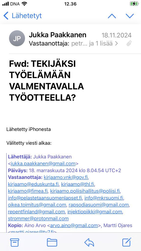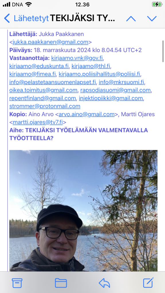 Lähetetty iPhonestaVälitetty viesti alkaa:Lähettäjä: Jukka Paakkanen <jukka.paakkanen@gmail.com> Päiväys: 18. marraskuuta 2024 klo 8.04.54 UTC+2 Vastaanottaja: kirjaamo.vnk@gov.fi, kirjaamo@eduskunta.fi, kirjaamo@thl.fi, kirjaamo@fimea.fi, kirjaamo.poliisihallitus@poliisi.fi, info@pelastetaansuomenlapset.fi, info@mkrsuomi.fi, oikea.toimitus@gmail.com, rapsodiasuomi@gmail.com, repentfinland@gmail.com, injektiopiikki@gmail.com, strommer@protonmail.com Kopio: Aino Arvo <arvo.aino@gmail.com>, Martti Ojares <martti.ojares@tv7.fi> Aihe: TEKIJÄKSI TYÖELÄMÄÄN VALMENTAVALLA TYÖOTTEELLA? [Lainattu teksti piilotettu] image0.jpeg 109K | |