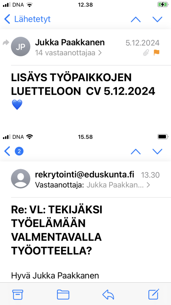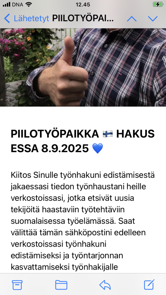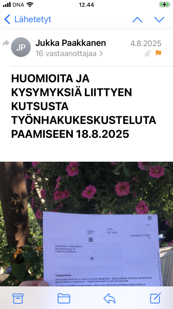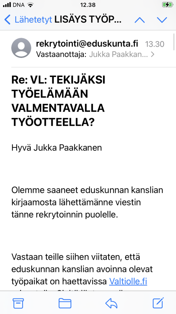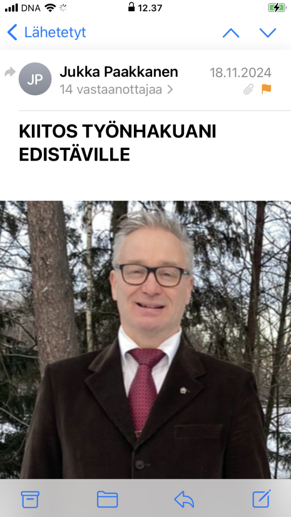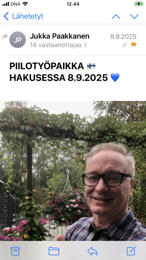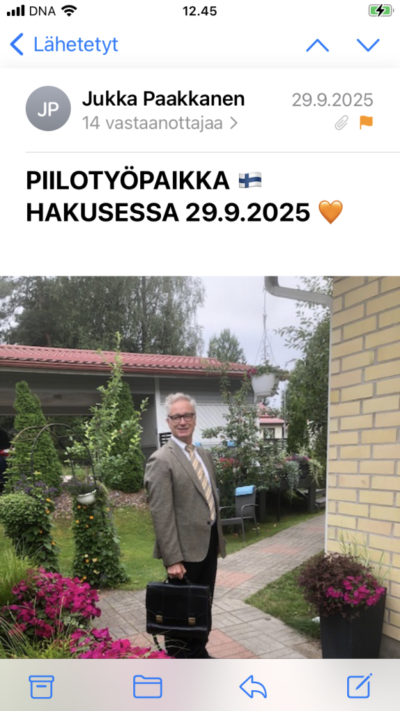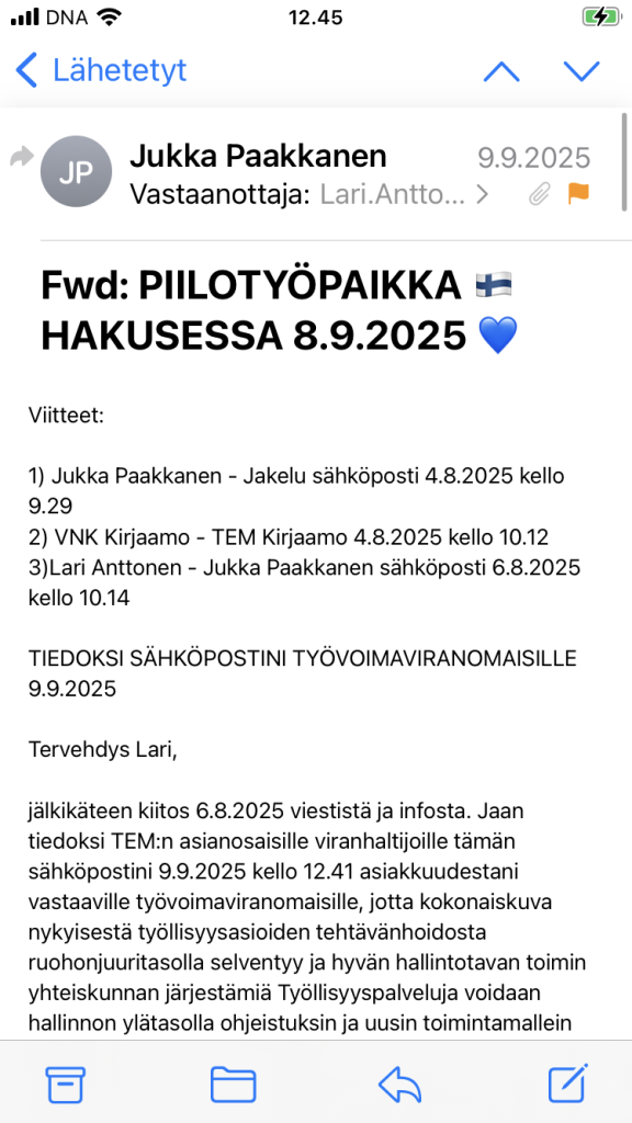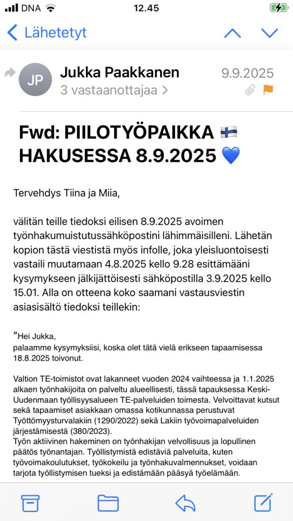 | Viitteet:1) Jukka Paakkanen – Jakelu sähköposti 4.8.2025 kello 9.29 2) VNK Kirjaamo – TEM Kirjaamo 4.8.2025 kello 10.123)Lari Anttonen – Jukka Paakkanen sähköposti 6.8.2025 kello 10.14TIEDOKSI SÄHKÖPOSTINI TYÖVOIMAVIRANOMAISILLE 9.9.2025Tervehdys Lari,jälkikäteen kiitos 6.8.2025 viestistä ja infosta. Jaan tiedoksi TEM:n asianosaisille viranhaltijoille tämän sähköpostini 9.9.2025 kello 12.41 asiakkuudestani vastaaville työvoimaviranomaisille, jotta kokonaiskuva nykyisestä työllisyysasioiden tehtävänhoidosta ruohonjuuritasolla selventyy ja hyvän hallintotavan toimin yhteiskunnan järjestämiä Työllisyyspalveluja voidaan hallinnon ylätasolla ohjeistuksin ja uusin toimintamallein kehittää paremmin ja tehokkaammin työnhakijoiden työllistymiseen olemassa oleviin työpaikkoihin tähtäävään päivittäiseen työskentelyyn ohjaten. Nykyisellään työssä on paljon turhaa joutokäyntiä ja keskittymistä epäolennaiseen toimeen. Nykyisellään tekijät ja työt tuntuvat heikosti kättelevän Työllisyyspalveluiden toimenpitein. Reipasta syksyn jatkoa. Valoa ja iloa.Jukka 👍🙂🇫🇮—- Jukka Paakkanen kapteeniluutnantti evp p. 050 340 7353jukka.paakkanen@gmail.comLepsämäntie 3-5 B 39, 01800 Klaukkala Lähetetty iPhonestaVälitetty viesti alkaa:Lähettäjä: Jukka Paakkanen <jukka.paakkanen@gmail.com> Päiväys: 9. syyskuuta 2025 klo 12.41.48 UTC+3 Vastaanottaja: tiina.heino@keskiuudenmaantepalvelut.fi, miia.malmberg@keusote.fi Kopio: info@keskiuudenmaantepalvelut.fi Aihe: Fwd: PIILOTYÖPAIKKA 🇫🇮 HAKUSESSA 8.9.2025 💙 [Lainattu teksti piilotettu] | |