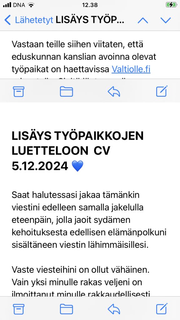 Jaoin tämän alla olevan sähköpostini 29.9.2025 sisällön laajalla jakelulla myös WhatsAppissa 27.9.2025 lähimmäisilleni.