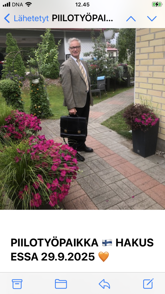 Lähetetty iPhonestaVälitetty viesti alkaa:Lähettäjä: Jukka Paakkanen <jukka.paakkanen@gmail.com> Päiväys: 29. syyskuuta 2025 klo 15.00.27 UTC+3 Vastaanottaja: tiina.heino@keskiuudenmaantepalvelut.fi, miia.malmberg@keusote.fi, info@keskiuudenmaantepalvelut.fi Kopio: kirjaamo.vnk@gov.fi, kirjaamo@eduskunta.fi, kirjaamo@thl.fi, kirjaamo@fimea.fi, kirjaamo.poliisihallitus@poliisi.fi, info@pelastetaansuomenlapset.fi, info@mkrsuomi.fi, oikea.toimitus@gmail.com, rapsodiasuomi@gmail.com, repentfinland@gmail.com, injektiopiikki@gmail.com, strommer@protonmail.com, arvo.aino@gmail.com, martti.ojares@tv7.fi Aihe: Fwd: PIILOTYÖPAIKKA 🇫🇮 HAKUSESSA 29.9.2025 🧡[Lainattu teksti piilotettu] PIILOTYÖPAIKKA 🇫🇮 HAKUSESSA 29.9.2025 🧡 Kiitos Sinulle työnhakuni edistämisestä jakaessasi tiedon työnhaustani heille verkostoissasi, jotka etsivät uusia tekijöitä haastaviin työtehtäviin suomalaisessa työelämässä. Saat välittää tämän sähköpostini edelleen verkostoissasi työnhakuni edistämiseksi ja työntarjonnan kasvattamiseksi työnhakijalle aktiivisessa työnhaussa. Virkistäviä syyspäiviä meille kaikille toivotellen. Valoa ja iloa. Jukka 👍🙂🇫🇮 P.s. Valokuva on otettu 18.8.2025 lähtiessäni tapaamiseen TE-virkailijoiden kanssa. Jaan alla tiedoksi viimeisimmän aktiivista työnhakuani edistävän toimen 23.9.2025. Video on liitetty työnhakuprofiileihini 26.9.2025 ja allaoleva teksti näkyy YouTubessa videon kuvauksessa. Jaan tiedoksenne myös viimeisimmän työhakemukseni 25.9.2025 tarjolla olevaan toimeen. Otan ilolla vastaan sähköpostiini kaikki työtarjoukset kaikista todellisista työmahdollisuuksista, jotka tarjoavat vuosiksi toimeentulon tuottavan näköalan elämään. —-26.9.2025 Latasin videon YouTubeen: https://youtube.com/shorts/elG6z974eA8?feature=share Videon kuvaus: ”Tervehdys videon katsojat 🏀, märkä ja liukas lehtien 🍂🍁🍂 peittämä alusta aiheutti pientä varovaisuutta liikkeissä… Tein 23.9.2025 nykytilanteessa jokapäiväisissä päivätoimissani tällaisen työnhaun virkistysvideon jaettavaksi laajalla jakelulla WhatsAppissa lähimmäisilleni. Jaan sen tänään 26.9.2025 edelleen täällä YouTubessa, jotta voin liittää sen julkisena videona linkillä erilaisiin työnhakupalveluihin internetissä. Vielä on miehessä pallon kanssa vähän hapuilevanakin virtaa. En ole pelannut enää vuosikymmeniin missään sarjoissa. Tyttöjeni kanssa heittelen ja pelailen välillä heitä opastaen ja kannustaen. Pelasin korista 🏀 juniorivuodet TOPOssa ja NKL-Panttereissa. Lopetin sarjapelit ennen kolmeakymppiä. Pelasin siis aikuisena muutaman vuoden 5. ja 4. Divareissa Suomi-sarjassa muun muassa Lännen Enkeleissä. Elämä näyttää, miten terveys miestä ajallaan kohtelee. Jos on isän geenit, hiipuu toimintakyky 75-vuoden iässä loppulaskuun. Vinkkaathan työnhaustani tuntemillesi työnantajille. Työnhakuprofiilini on löydettävissä julkisesti muun muassa Valtiolle.fi ja Työmarkkinatori.fi ja Laura.fi työnhakupalveluissa. Töitä hakee 51-vuotias meriupseeritaustainen liideri. Rentoa syksyn jatkoa sinulle ja rakkaillesi. Valoa ja iloa. Jukka 👍🙂🇫🇮” —-25.9.2025 Ylitarkastaja (tuloksellisuustarkastus, valtion omaisuus ja julkinen hallinto)Valtiontalouden tarkastusvirasto | Hakuaika päättyy: 10.10.2025 16:15 Hakemus tehtävään Vapaamuotoinen hakemuksesi tehtävään: TÄSSÄ OLEN – TARKASTAMAAN JA TEKEMÄÄN MUUTOSTA Olen itsenäinen ja harkitseva asioiden ja ihmisten johtaja. Olen kekseliäs ja innovatiivinen ajattelija ja uudentyyppisten ratkaisujen ja toimintamallien kehittäjä. Olen suora, aito, avoin ja umpirehellinen suorapuheinen suomalainen mies. Koulutukseltani olen rakennuspiirtäjä, ylioppilas ja upseeri. Olen neljän lapsen isä ja yhden naisen elämänkumppani. Olen erilaisiin verkostoihin nähden sitoutumaton ja yhteiskunnallisesti tarkastellen neitseellinen lähimmäinen. Olen aikanaan kutsuttaessa mukaan kieltäytynyt liittymästä vapaamuurariloossiin. En ole tänä päivänä enää minkään uskonnollisen yhteisön jäsenrekisterissä jäsenenä. Olen täysivaltainen Suomen kansalainen. Minulla ei ole vastattavaa lähimmäisilleni eikä lainoja tai velkaa pankeille. Olen onnellinen ja rehellinen mies. Teen sen, mitä lupaan. Olen käytökseltäni korrekti, luotettava ja vastuuntuntoinen työntekijä. Pyrin työssäni korkeaan laatuun ja asetettujen tavoitteiden päämäärätietoiseen saavuttamiseen. Kykenen käsittelemään laajoja asiakokonaisuuksia ja hahmottamaan organisaation kannalta keskeiset ja toiminnan kannalta tärkeät tekijät. Ohjaan organisaatiossa asetetun tavoitteen saavuttamiseen tähtäävää työskentelyä kärsivällisesti ja alaiseni huomioonottavasti, kuitenkin vaatien sekä omalta työltäni että muilta ohjauksessani olevilta toimijoilta tavoitteeseen sitoutunutta asennetta ja työotetta. Olen hyvä organisoija ja suunnittelija, innovatiivinen ja kekseliäs visiönääri. Tarjoan osaamisalueitani työnantajan käyttöön: Opetus ja koulutus: Yli kymmenen vuoden työkokemus Puolustusvoimissa kantahenkilökunnan ja asevelvollisten kouluttamisesta vaihtelevissa olosuhteissa eri kokoisille koulutusryhmille ryhmästä komppaniakokoonpanoon ja aluksen henkilöstöstä laivueen henkilöstölle. Teoreettiset tiedot opettamisesta ovat kasvatustieteen perusopintojen mukaiset höystettynä vahvalla kouluttajakokemuksella. Henkilökohtaisena kehitysalueena opetuksen saralla puuttuu pedagoginen pätevyys, jonka saatan hankkia työn ohessa vaadittavilla jatko-opiskeluilla. HR: Esimieskokemuksen myötä ymmärrys ja osaaminen HRM- ja HRD-asioissa. Vahva ihmistuntemus ja valmiudet hyvään esimiestyön tukemiseen ja alaisvalmiuksien kehittämiseen organiosaatiossa. Valmiudet tukea asiantuntijoita saavuttamaan HR-palvelutoimenpitein paremmin omat tavoitteensa. Johtaminen ja esimiestyö: Hyvät valmiudet ihmisten johtamisessa ja asioiden organisoimisessa asetettuj