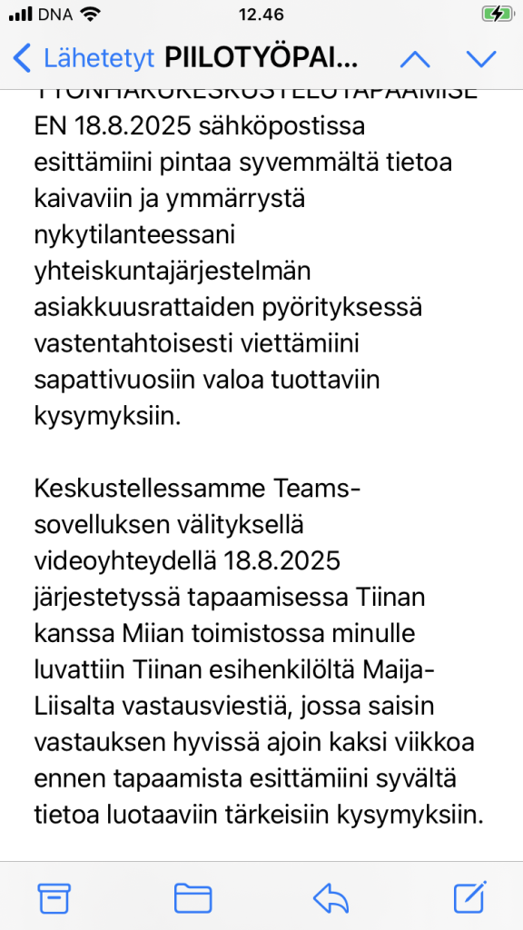 ”Kaipaan edelleen vastausta TE-palveluiden edustajalta 4.8.2025 sähköpostissa esitettyihin kysymyksiin, joihin en ole saanut TE-viranomaisilta vastausta: