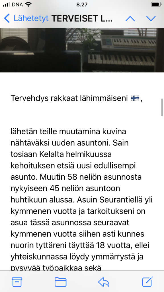 | TERVEISET LEPPIKSESTÄ 30.4.2025 🐞 Tervehdys rakkaat lähimmäiseni 🇫🇮, lähetän teille muutamina kuvina nähtäväksi uuden asuntoni. Sain tosiaan Kelalta helmikuussa kehoituksen etsiä uusi edullisempi asunto. Muutin 58 neliön asunnosta nykyiseen 45 neliön asuntoon huhtikuun alussa. Asuin Seurantiellä yli kymmenen vuotta ja tarkoitukseni on asua tässä asunnossa seuraavat kymmenen vuotta siihen asti kunnes nuorin tyttäreni täyttää 18 vuotta, ellei yhteiskunnassa löydy ymmärrystä ja pysyvää työpaikkaa sekä yhdenvertaista osallisuutta eläkekertymän kokoamiseen vanhuusvuosien turvaksi ajassa. Olen palvellut elämälläni Luojaani uskollisesti ja kuuliaisesti ajassa ja Elävä Jumala HERRA JEESUS on pitänyt tarpeistani kaikin puolin erinomaisen hyvin huolen halki elämäni. Minulta ei puutu elämästäni mitään muuta kuin ansiotyöpaikka, joka on lähimmäisteni ymmärryksen ja hyvän tahdon varassa. Olen päättänyt nyt vain kuulostella, mitä lähimmäiseni tahtovat minulle yhteiskunnallisesti tarkastellen neitseelliselle ja vapaalle sielulle ajassa kertoa yhteiskunnallisesta elämästään ajassa. Osallistun mielelläni vielä olemassa olevan työn tekemiseen, mutta vain yhdenvertaista osallisuutta vastaan hyvinvointiyhteiskunnassa vauraassa Suomessa, jossa ajallista elämääni elän. Olen onnellinen ja rehellinen mies. Vapaana ja täysivaltaisena Suomen kansalaisena vietän aikaani siellä, missä tahdon ja missä minua eniten kaivataan. Jaan enimmän osan elämääni Isan, Elisan ja Merituulin rinnalla Röykässä ja tuen aikuisten lasteni Antonin ja Alinan elämää parhaan kykyni mukaisesti vastuullisena vanhempana edelleen heidän ottaessaan omia askeleitaan aikuiseen itselliseen elämään tahoillaan. Jos nyt rohkaistut mainitsemaan minusta verkostoissasi tuntemillesi työnantajatahoille, arvostan sitä suuresti. Vieläköhän Merisotakoululla tai Upinniemessä olisi toimistotöitä tarjolla meriupseerille ennen säädettyä 55 vuoden virasta eroamisikää? 😉 Tervetuloa kahville tai vaikka saunomaan ja parantamaan yhteyttä kauan yhteiskunnan sivulaidalla dispositiossa pidettyyn mieheen. Olen sama lämminsydäminen ja elämää laajalti ymmärtävä mies kuin ennenkin. Olen saattanut jopa kasvaa henkisesti ja hengellisestikin viime vuosikymmeninä muutaman tuuman verran. Tule reilusti kohtaamaan lähimmäisesi ajassa. Toivorikasta ja reipasta kevättä meille kaikille. Valoa ja iloa. Jukka 👍🙂🇫🇮 p. 050 340 7353jukka.paakkanen@gmail.com P.s. Ajatuksia herättämään ja oivalluksia synnyttämään jaan alla lyhyen toimenpideluettelon tiedoksenne, jos Suomi tahtoo oikeasti kehittää yhdenvertaista ja tasa-arvoista yhteiskuntajärjestelmää kaikille kansalaisille hyvän elämän tarjoavaan suuntaan ajallisessa lyhytkestoisessa elämässä. Ohjeet perustulon suuruuden määrittämiseksi ja rahan maksamiseksi kansalaisille: Määritä populaation suuruus (noin 5,6 miljoonaa Suomen kansalaista)Määritä realistinen todellisiin elinkustannuksiin sidottu keskimääräinen perustoimeentulon (asuminen, ravinto, lääkintä, vaatetus, liikkuminen, kulttuuri ja liikunta) edellyttämä rahan määrä kuukaudessa asukasta kohden (noin 2000 euroa kuukaudessa)Määritä kansakunnan todellinen varallisuus (Suomen valtion ja suomalaisten yritysten sekä yksityishenkilöiden omaisuus ja varallisuus)Määritä tarvittava veropohja koko Suomen kansalle vauvasta vaariin samansuuruisena maksettavan perustulon edellyttämän rahamäärään keräämiseksi veronalaisilta Suomessa. Kerää verot veronalaisilta veronmaksajilta olemassa olevan todellisen omaisuuden ja varallisuuden mukaisesti. Maksa perustulo jokaiselle Suomen kansalaiselle samansuuruisena ylläpitämään talousjärjestelmän häiriötön toimivuus kulutukseen perustuvassa yhteiskuntajärjestelmässä jatkuvan todellisiin tarpeisiin perustuvan kysynnän ja tarjonnan ylläpitämiseksi kansallisessa taloudessa Suomessa. Kansalaiset kuluttavat laskennallisen perustulon verran kuukausittain julkisessa taloudessa, jolloin maksetut varat palautuvat verotettuina uudelleen julkisen talouden edellyttämiin tulonsiirtoihin takaisin. Kansallinen perustulo on verotonta ja ilman erillisiä ehtoja yhdenvertaisesti jokaiselle Suomen kansalaiselle kuukausittain samansuuruisena maksettavaa rahaa, joka ylläpitää julkisen talouden toimintakyvyn poikkeuksetta suomalaisessa yhteiskuntajärjestelmässä. Työstä maksettavaa palkkaa määritettäessä otetaan suomalaisessa työelämässä huomioon valtion kaikille samansuuruisena maksettavan perustulon rahan jokaiselle tarjoama vähimmäistoimeentulon ja yhdenvertaisen osallisuuden rahalla toimivassa talouskasvuun ja kulutukseen nojaavassa yhteiskuntajärjestelmässä tarjoama perälauta. Näin toimien jokainen kansalainen voi vastaanottaa kaikissa tilanteissa tarpeiden mukaan tarjolla olevia työmahdollisuuksia, kun tehtävä työ aina kasvattaa työntekijän todellista kulutusvoimaa tilanteessa, jossa yhteiskunnan jokaiselle kansalaiselle samansuuruisena maksettava perustulon tulonsiirtona maksettava raha säilyy tulona tarjotun lyhytkestoisenkin työn vastaanottamisen jälkeen, jolloin yhteiskunnassa päästään eroon erilaisten sosiaalisten tukien maksamisen synnyttämistä tuloloukuista, jotka estävät tarjottujen huonosti palkattujen ja lyhytkestoisten töiden vastaanottamista avoimilla työmarkkinoilla. Valtio voisi sijoittaa enimmän osan alaikäisille kansalaisille maksetuista perustulon kuukausittaisista rahoista sijoitusrahastojen rahasto-osuuksiin, joista kertyneet varat vapautuvat kunkin kansalaisen omaan hallintaan täysi-ikäisyyden saavuttamisen jälkeen mahdollistaen jokaiselle kansalaiselle koulussa hankittujen valmiuksiensa ja kykyjensä mukaisesti työelämään siirtymiseksi edellytettävät jatko-opinnot taloudellista vakautta nuoren aikuisen elämään tarjoten ja tulevan ensiasunnon hankinnan alkupääomaksi yhdenvertaisessa taloudel