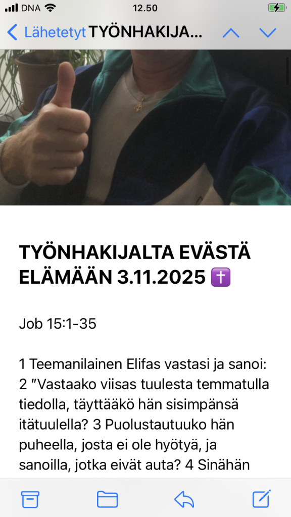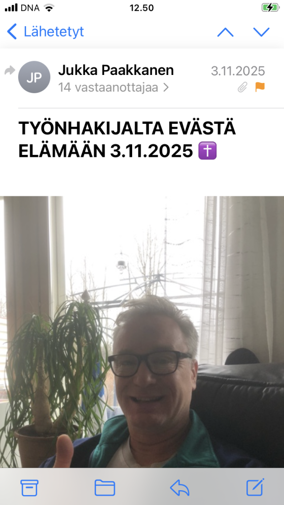 | Tervehdys Tiina, Miia ja Tiinan esihenkilö, välitän teille tiedoksi tänään 14.11.2025 viimeisimmän tiedon aktiivisesta työnhaustani välittämällä teille kolme lähimmäisilleni edelleen välitettäväksi loka- ja marraskuussa jakamaani sähköpostia. Tämä on toinen välitetty sähköposti. Voitte halutessanne jakaa kaikki aiemmat ja tulevat sähköpostini edelleen ajatuksia herättämään ja ymmärrystä lisäämään organisaatioidenne sisällä sekä kenelle vain lähimmäiselle lähellä ja kaukana aktiivisen työnhakuni menneiden vuosien todistusvoimalla osoitetusti heikosti toimivan työllisyyden hoidon vaikuttavuuden parantamiseksi yhteiskunnallisen keskustelun ja päätöksenteon avulla nykytilanteessa vapaasta tahdostani antamani esimerkkitapauksen käsittelyn avulla. Odotan edelleen TE-viranomaisten edustajalta vastauksia 4.8.2025 esittämiini kysymyksiin, jotka kirjallisen vastaamisen helpottamiseksi numeroin erikseen 1.-20. edellisessä teille jakamassani sähköpostissa 29.9.2025. Näillä ajatuksin. Reipasta syksyn jatkoa meille kaikille. Valoa ja iloa. Jukka 👍🙂🇫🇮 P.s. En saanut viikolla 43 kutsua työhaastatteluun hakemaani tehtävään (Ylitarkastaja (tuloksellisuustarkastus, valtion omaisuus ja julkinen hallinto) ID 15553). —- Jukka Paakkanenkapteeniluutnantti evp p. 050 340 7353jukka.paakkanen@gmail.comLepsämäntie 3-5 B 39, 01800 Klaukkala Lähetetty iPhonestaVälitetty viesti alkaa:Lähettäjä: Jukka Paakkanen <jukka.paakkanen@gmail.com> Päiväys: 3. marraskuuta 2025 klo 10.40.37 UTC+2 Vastaanottaja: kirjaamo.vnk@gov.fi, kirjaamo@eduskunta.fi, kirjaamo@thl.fi, kirjaamo@fimea.fi, kirjaamo.poliisihallitus@poliisi.fi, info@pelastetaansuomenlapset.fi, info@mkrsuomi.fi, oikea.toimitus@gmail.com, rapsodiasuomi@gmail.com, repentfinland@gmail.com, injektiopiikki@gmail.com, strommer@protonmail.com Kopio: arvo.aino@gmail.com, martti.ojares@tv7.fi Aihe: TYÖNHAKIJALTA EVÄSTÄ ELÄMÄÄN 3.11.2025 ✝️ TYÖNHAKIJALTA EVÄSTÄ ELÄMÄÄN 3.11.2025 ✝️ Job 15:1-35 1 Teemanilainen Elifas vastasi ja sanoi: 2 ”Vastaako viisas tuulesta temmatulla tiedolla, täyttääkö hän sisimpänsä itätuulella? 3 Puolustautuuko hän puheella, josta ei ole hyötyä, ja sanoilla, jotka eivät auta? 4 Sinähän teet tyhjäksi jumalanpelonkin ja häiritset hiljentymistä Jumalan edessä. 5 Pahuutesi neuvoo suutasi, sinä valitset viekkaitten kielen. 6 Oma suusi julistaa sinut syylliseksi, en minä. Omat huulesi todistavat sinua vastaan. 7 Synnyitkö sinä ihmisistä ensimmäisenä, luotiinko sinut ennen kukkuloita? 8 Oletko ollut kuulemassa Jumalan neuvonpitoa ja sieltä siepannut viisauden itsellesi? 9 Mitä sinä tiedät, jota me emme tietäisi? Mitä sinä ymmärrät, jota mekin emme tuntisi? 10 Onhan meidänkin joukossamme harmaapää ja vanhus, iältään isääsikin vanhempi. 11 Väheksytkö Jumalan lohdutuksia, sanaa, jonka hän puhui sinulle lempeästi? 12 Miksi annat sydämesi kiihtyä, miksi silmäsi pyörivät? 13 Sinähän käännät kiukkusi Jumalaa vastaan ja syydät sanoja suustasi! 14 Kuinka ihminen voisi olla puhdas, kuinka naisesta syntynyt vanhurskas! 15 Katso, pyhiinsäkään hän ei luota, eivät taivaatkaan ole hänen silmissään puhtaat, 16 saati sitten ihminen, inhottava ja kelvoton, joka juo vääryyttä kuin vettä.”17 ”Kuuntele minua, minä ilmoitan sinulle, minä kerron, mitä olen nähnyt. 18 Näin viisaat ilmoittavat eivätkä salaa, mitä ovat isiltään oppineet, 19 niiltä, joille yksin maa oli annettu ja joiden seassa ei muukalainen liikkunut: 20 ’Jumalaton elää pelossa koko elämänsä ajan, ne harvat vuodet, jotka väkivaltaiselle on määrätty. 21 Kauhun äänet kuuluvat hänen korvissaan, keskellä rauhaakin hävittäjä käy hänen kimppuunsa. 22 Hän ei usko pääsevänsä pimeydestä, hänet on miekalle määrätty. 23 Hän harhailee etsien leipää: missä sitä on? Hän ymmärtää, että hänelle on valmiina pimeyden päivä. 24 Hätä ja ahdinko kauhistuttavat häntä, ne ryntäävät hänen kimppuunsa kuin kuningas, joka on valmiina hyökkäykseen, 25 koska hän ojensi kätensä Jumalaa vastaan, uhitteli Kaikkivaltiaalle 26 ja ryntäsi häntä vastaan niska köyryssä, paksujen kilvenkupujensa suojassa. 27 Vaikka hän peitti kasvonsa ihrallaan ja kasvatti lanteensa lihaviksi, 28 asui hävitetyissä kaupungeissa, taloissa, joissa ei ollut lupa asua, jotka oli määrätty jäämään raunioiksi, 29 ei hän rikastu, eikä hänen omaisuutensa ole pysyvää. Hänen tähkänsä eivät taivu maata kohden. 30 Ei hän pääse pimeydestä, liekki korventaa hänen versonsa, Herran suun henkäyksestä hän häviää. 31 Älköön hän luottako tyhjään – hän tulee pettymään. Hänen voittonsa häipyy tyhjiin. 32 Mitta täyttyy ennen aikojaan, eikä hänen lehvänsä vihannoi. 33 Hän on kuin viiniköynnös, joka pudottaa raakileensa, kuin öljypuu, joka varistaa kukkansa. 34 Jumalattoman joukko on hedelmätön, tuli kuluttaa lahjustenottajan teltat. 35 He kantavat sisällään tuhoa ja synnyttävät turmiota, heidän kohtunsa valmistaa petosta.’” Lähde: https://www.bible.com/bible/1745/JOB.15.FINRK Jes. 62:1-12 1 Siionin tähden en voi vaieta, Jerusalemin tähden en saa rauhaa, ennen kuin sen vanhurskaus nousee kuin kirkas valo ja sen pelastus kuin leimuava soihtu. 2 Kansat näkevät sinun vanhurskautesi, kaikki kuninkaat kunniasi, ja sinulle annetaan uusi nimi, jonka Herran suu säätää. 3 Sinusta tulee kaunis kruunu Herran kädessä, kuninkaallinen päähine Jumalasi kämmenellä. 4 Ei sinua enää sanota hylätyksi eikä sinun maatasi autioksi, vaan sinua kutsutaan nimellä Rakastettuni ja sinun maatasi nimellä Aviovaimo, sillä Herra rakastaa sinua ja ottaa sinun maasi omakseen. 5 Niin kuin nuori mies ottaa neitsyen vaimokseen, niin ottavat sinun lapsesi sinut omakseen, ja niin kuin sulhanen iloitsee morsiamesta, niin iloitsee Jumalasi sinusta.6 Sinun muureillesi, Jerusalem, minä olen asettanut vart