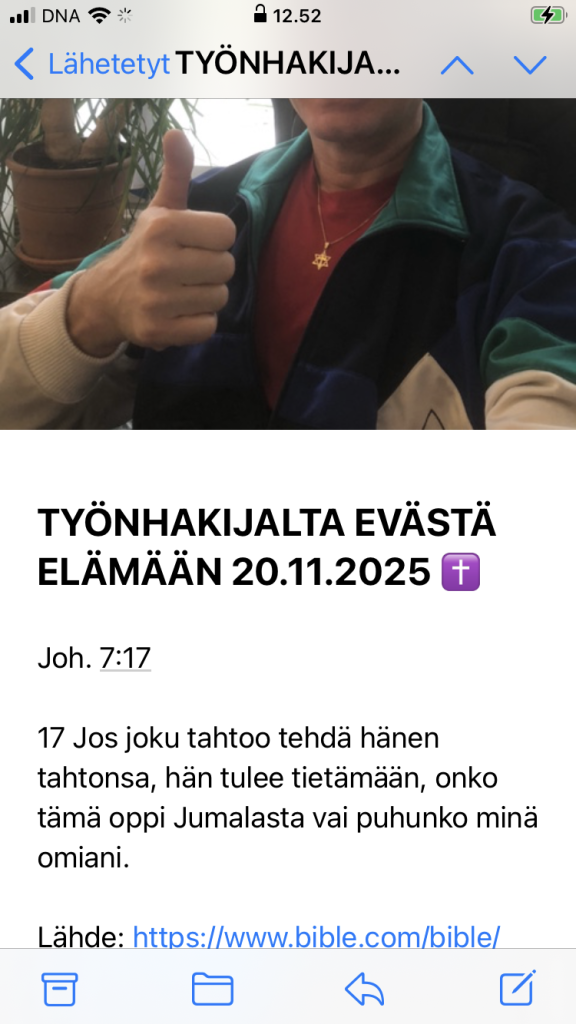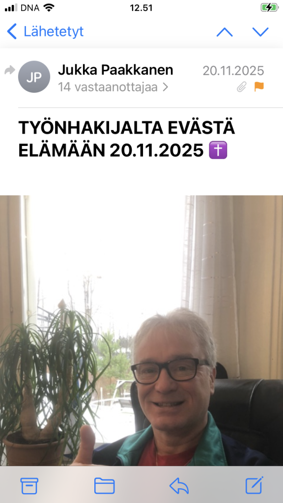 P.p.p.s. Koska koen sydämessäni nyt ilmaisseeni tällä laajalla jakelulla aiempina työnhakuvuosinani HERRAN JEESUKSEN tahdosta Herran palvelijana antamani todistuksenkin jälkeen kyllin voimallisesti haluavani vielä osallistua työelämään ennen eläköitymisikää haastavissa työtehtävissä, totean nyt tämän jäävän viimeiseksi tällaiseksi Työnhakijalta evästä elämään -sähköpostiksi tällä jakelulla. Toivotan kaikille uudestisyntyneille hengellisille Jumalan lapsille lähellä ja kaukana runsasta Rakastavan Jumalan Siunausta ja Jeesuksen Kristuksen Rauhaa. Kaikille lähimmäisilleni lähellä ja kaukana toivotan elämässä, kuten yhteiskunnissa kaikkialla on tapana toivottaa, onnea ja menestystä, mitä se sitten itsekullekin ajallisessa elämässä tarkoittaa. Hyvää ja reipasta loppuvuotta 2025 ja alkavaa uutta vuotta 2026 meille kaikille. Valoa ja iloa. 👍🙂🇫🇮